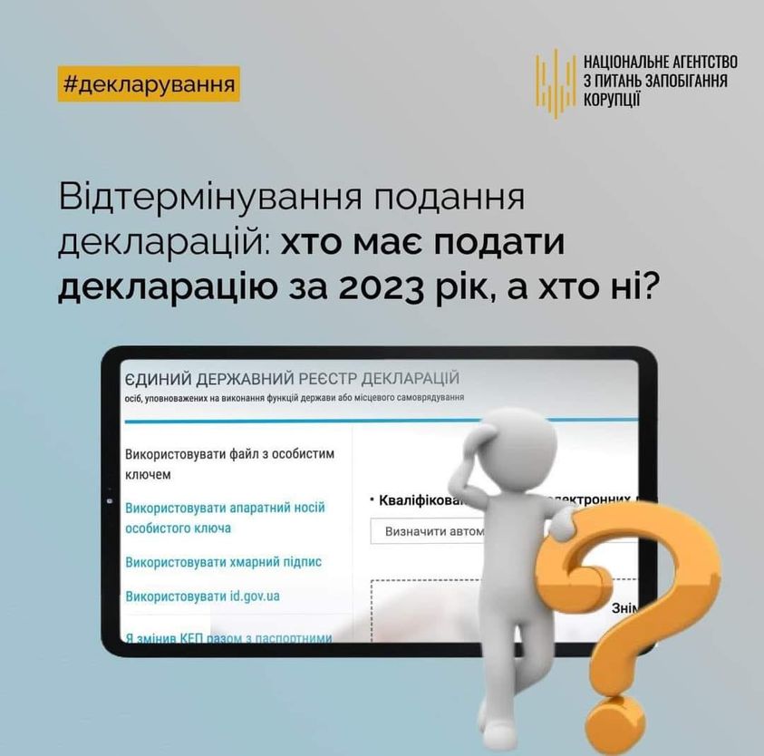 Закликаємо службовців своєчасно та відповідально відзвітувати за свої статки та нагадуємо, що для певних категорій декларантів обов’язок подання декларацій відтерміновано – їм потрібно буде це зробити не пізніше 90 днів після зміни умов, які надають їм таке право.