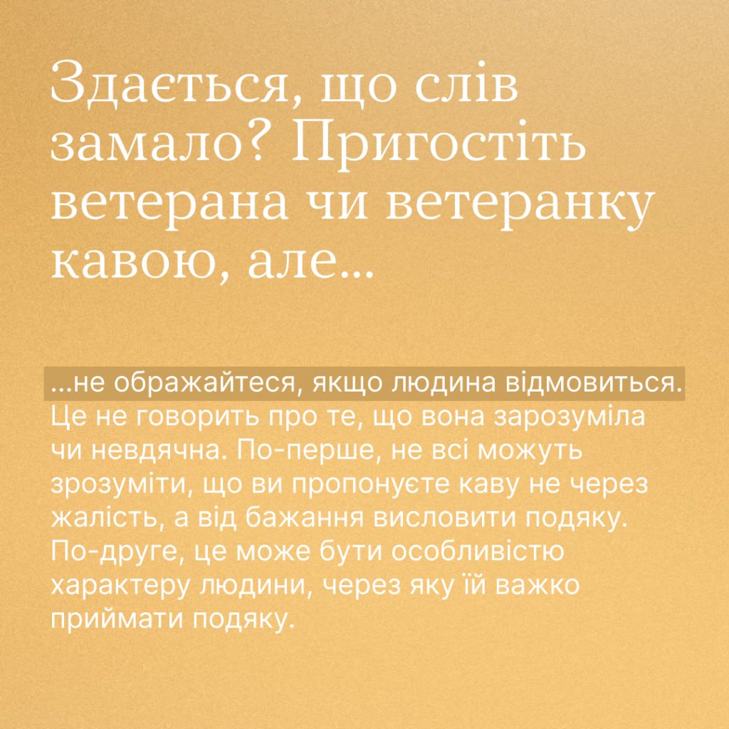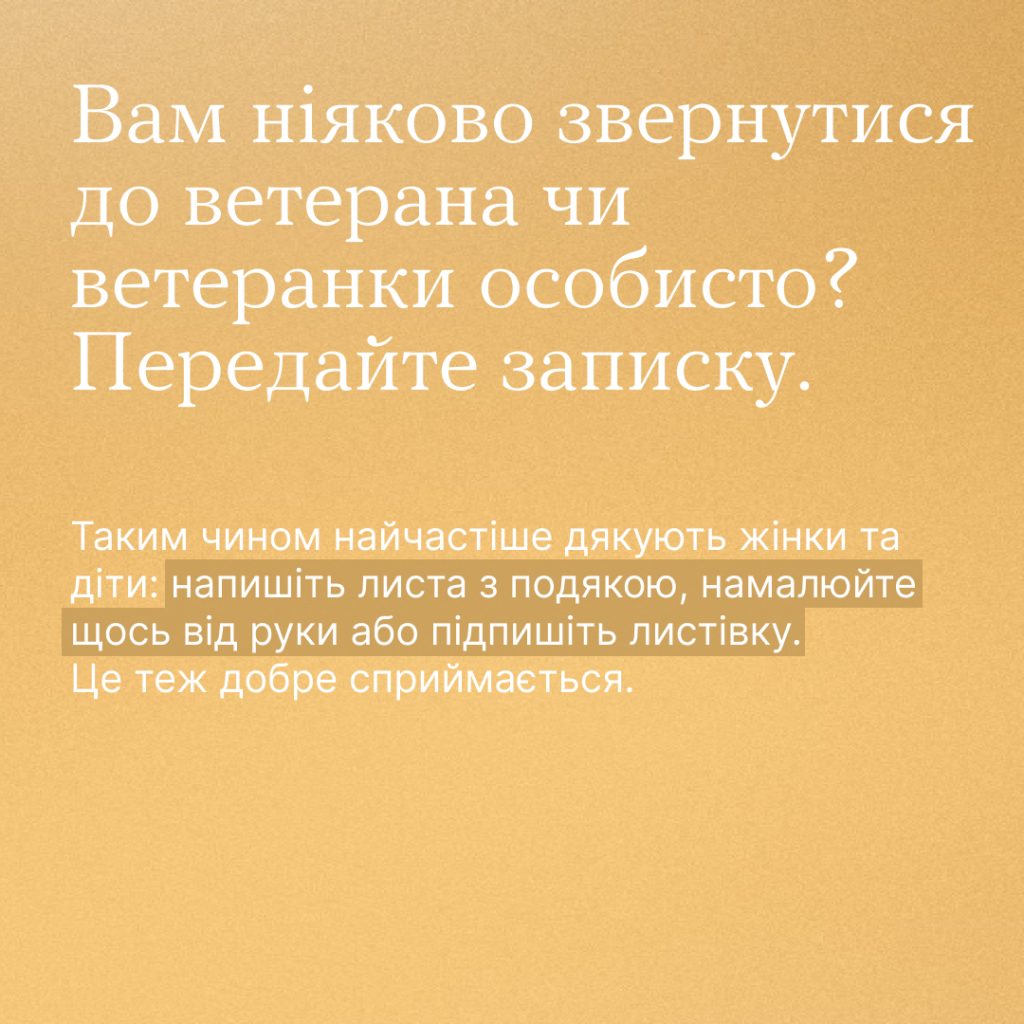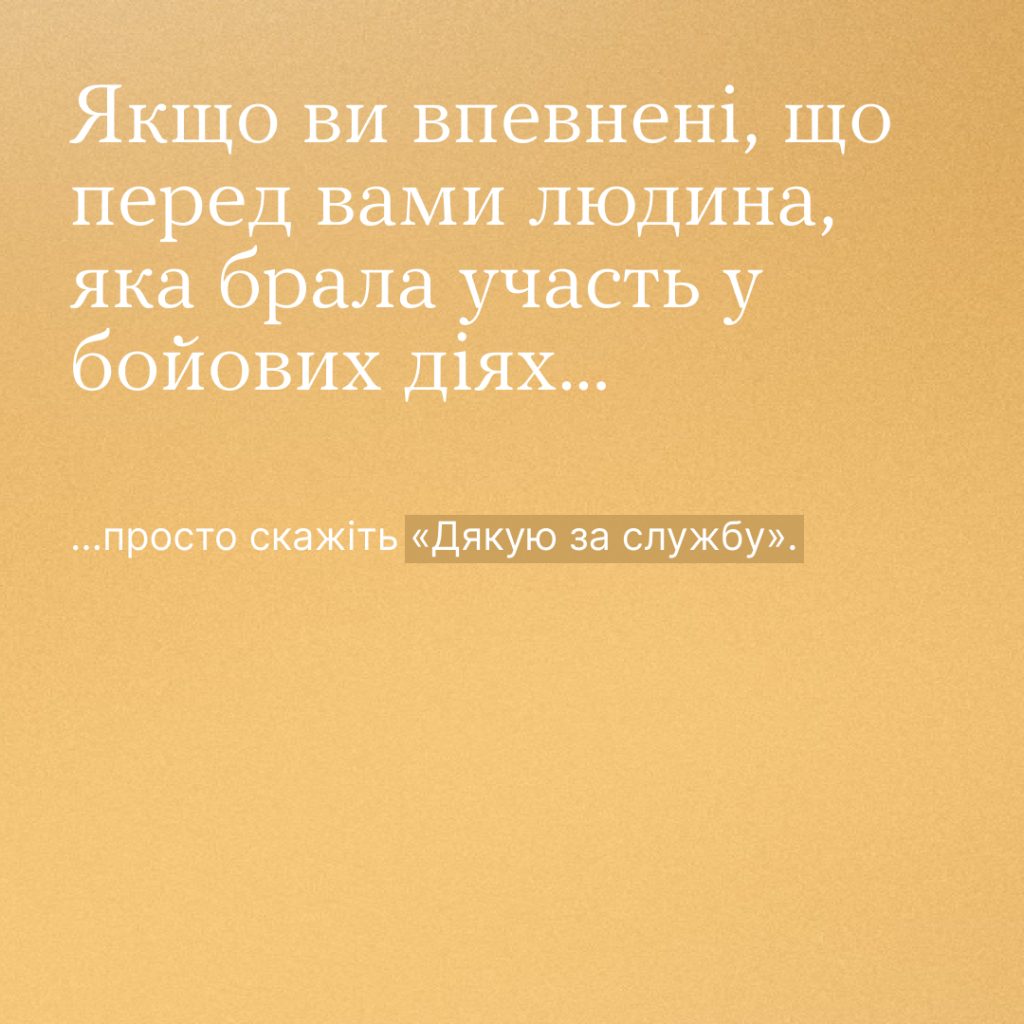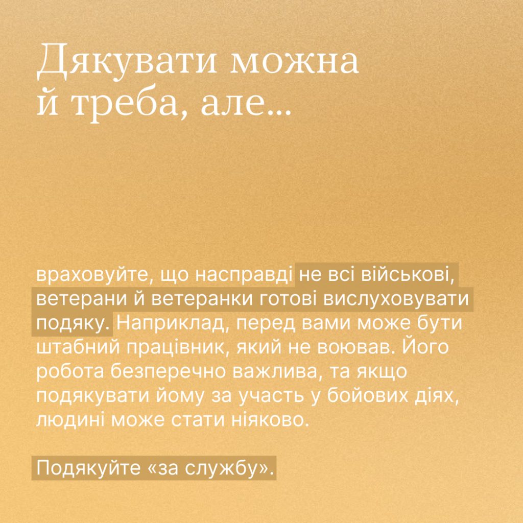 Буває, зустрічаємо військових або дізнаємося, що перед нами ветеран чи ветеранка, зринає думка — як подякувати людині за службу так, щоб не бути навʼязливим, не бовкнути зайвого, не образити?
