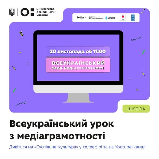 Всеукраїнський урок з медіаграмотності реалізовує національний проєкт з медіаграмотності «Фільтр» Міністерство культури України та Суспільне Мовлення у партнерстві з Міністерством освіти і науки України та за підтримки UNDP Ukraine / ПРООН в Україні та фінансування уряду Японії.