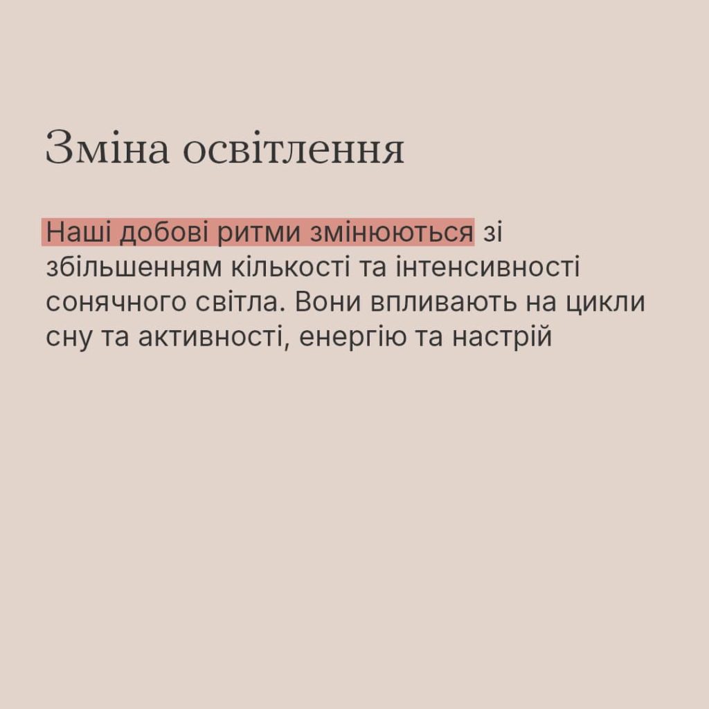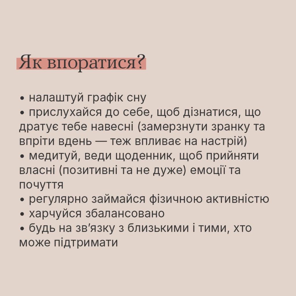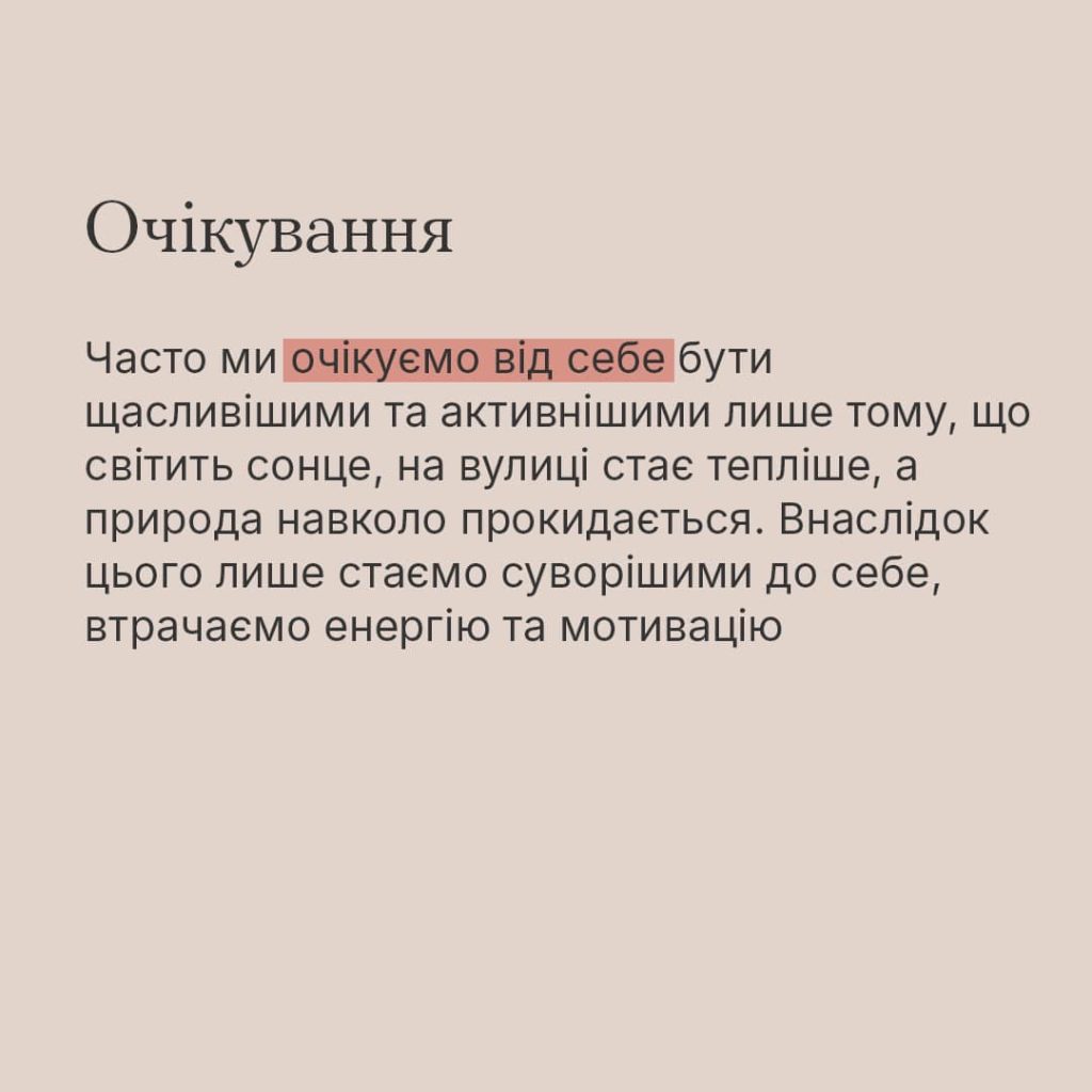 І пам’ятай (в будь-який сезон): ми не можемо зупинити планету, скасувати зміну пір року та інші речі, що нам не під силу. Але можемо взяти відповідальність за своє ментальне здоров’я та подбати про нього.