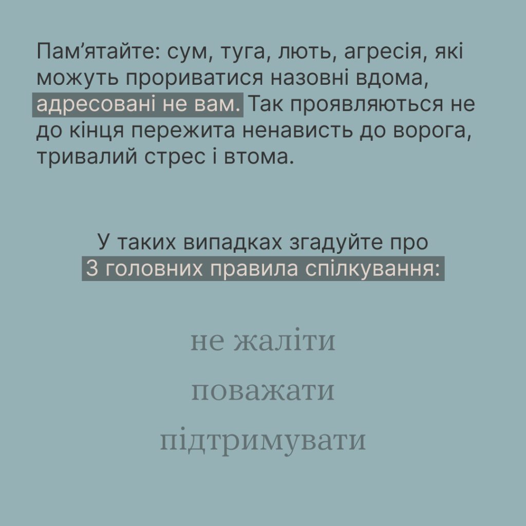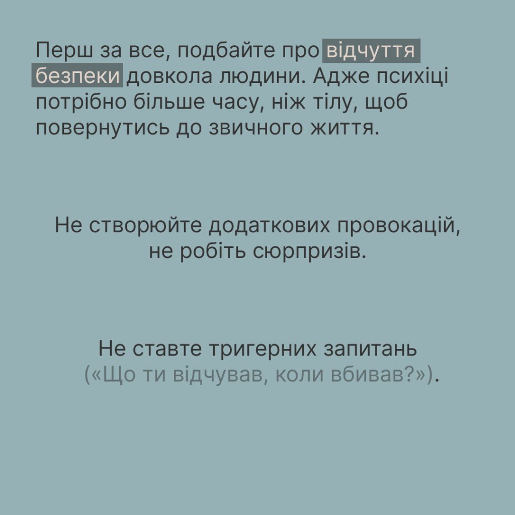 Важливо пам’ятати, що тепер ваші рідні чи товариші мають особливий досвід. А фізіологічний стан, в якому вони перебували, відрізнявся від того, в якому ми звикли жити щодня. Фактично людина тривалий час була на межі життя і смерті, а це вплинуло на її свідомість і на те, яким вона бачить світ довкола. Знадобиться певний час, аби минули надмірне збудження, тривожність та підсвідоме очікування небезпеки.
